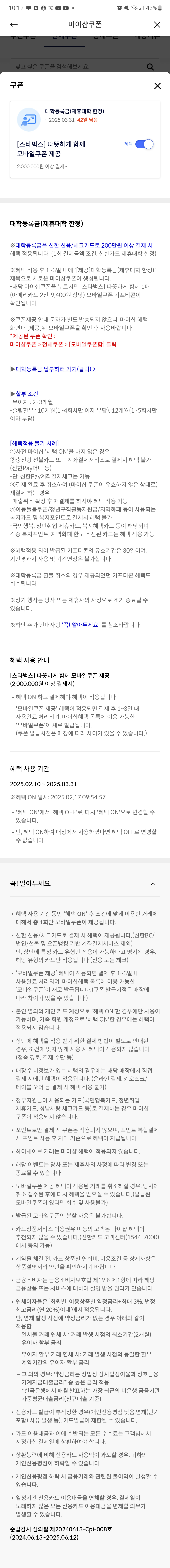 ④ '혜택'을 클릭해서 파란색으로 ON 시키셔야지만 커피 쿠폰을 받을 수 있습니다.
