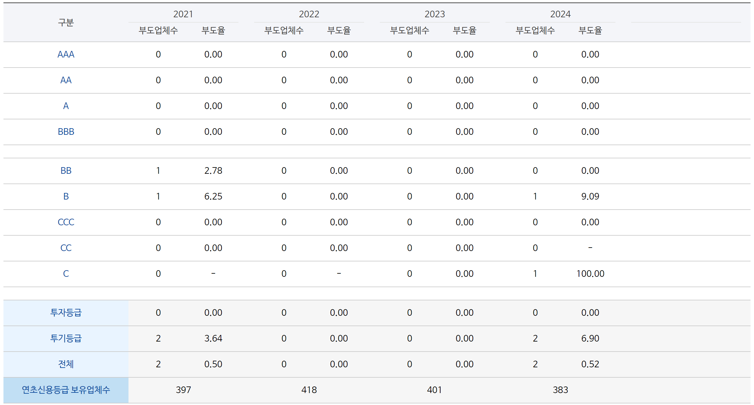 투자등급(AAA, AA, A, BBB)은 대부분 부도가 없거나 부도율이 0%에 가까운 수준이다.