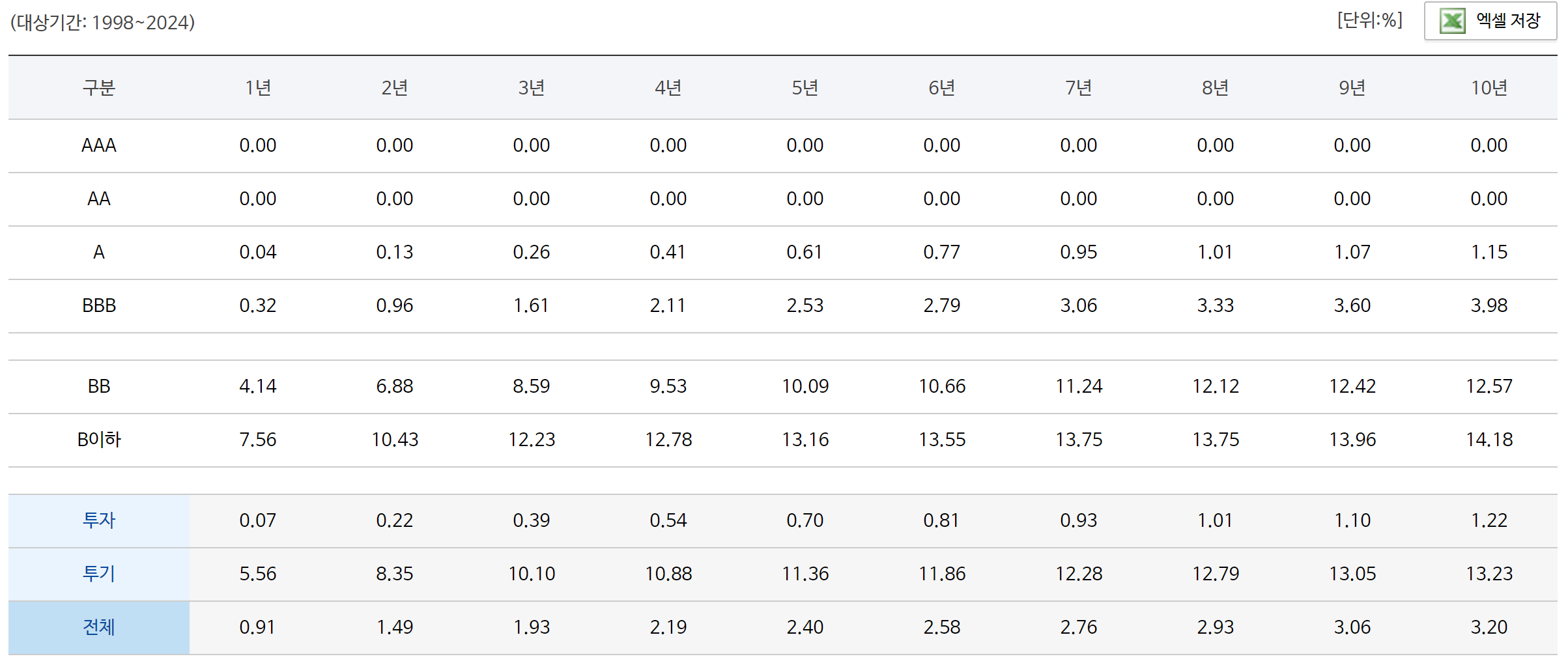 - BBB 등급: 부도율이 점차 증가하는 경향을 보인다. 1년차 부도율은 0.32%에서 시작하여 10년차에는 3.98%, 20년차 이후에는 6.4%로 꾸준히 상승한다.