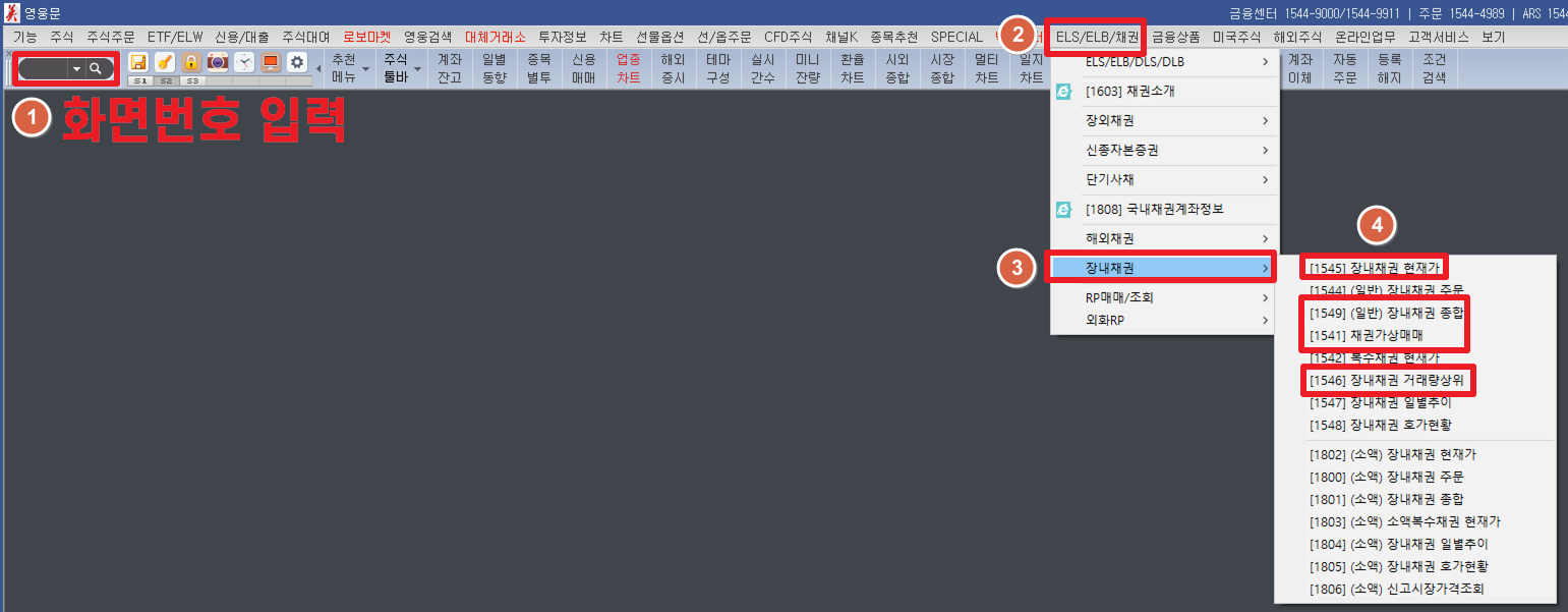 'ELS/ELB/채권' 탭에서 장내채권의 [1545], [1549], [1541],[1546] 화면을 열면된다.