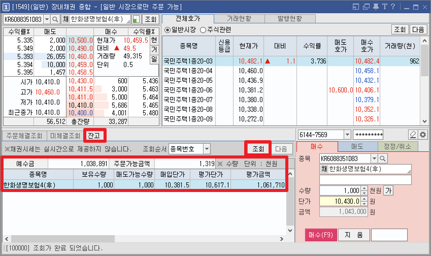 ▼매수가 체결되면 [1549] 화면 '잔고'에 채권 종목이 표시된다.