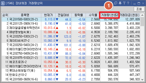 ▼ [1546] 장내 채권 거래량 상위 화면에서 수익률이 높은 채권 종목을 클릭한다.