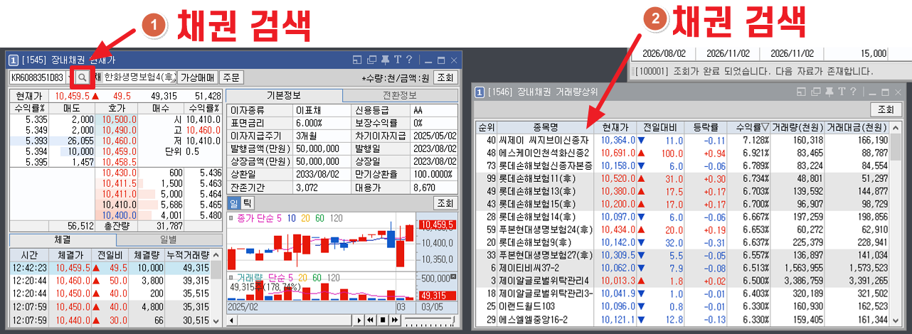 찾기 버튼(돋보기)을 클릭해서 채권을 찾거나 [1546] 장내채권 거래량 상위에서 채권을 찾아도된다.