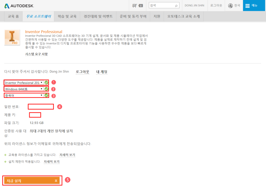 (메일로도 일련번호와 제품키가 발송이 됩니다. 일련번호와 제품키는 인벤터(Inventor)설치할때 입력하시면 됩니다.)